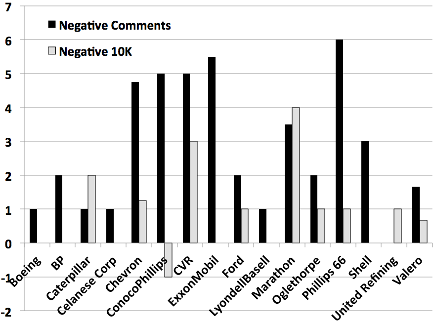 The study finds that oil companies made significantly more predictions about how the Renewable Fuel Standard would harm them in comments than they disclosed in their 10-K statements. For example, one oil company told the EPA that if the Renewable Fuel Standard wasn’t changed, it would “limit the supply of gasoline and diesel fuel” and cause “severe economic harm.” In its securities disclosure, the only thing its parent company told its investors was that rules like the Renewable Fuel Standard were creating a strong market for biofuels. And it even implied that that was a good thing because it had a side business as a biofuel producer.
