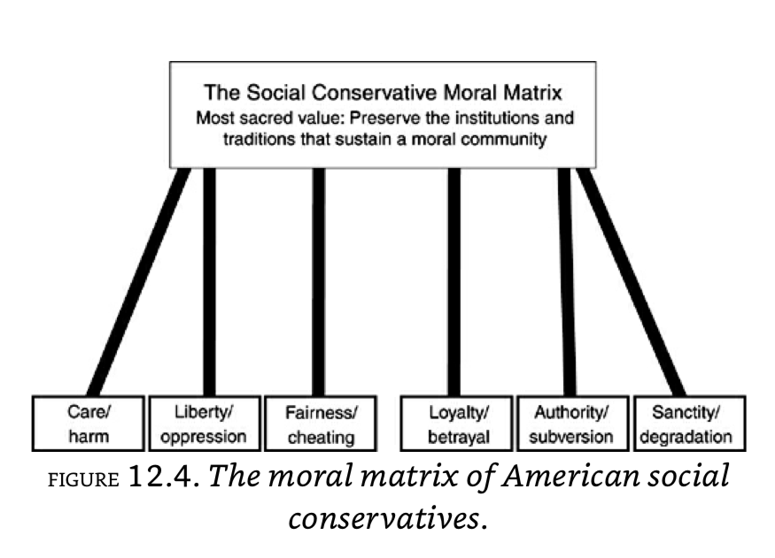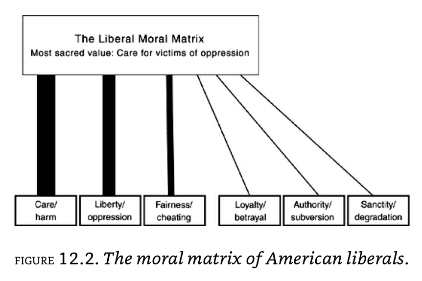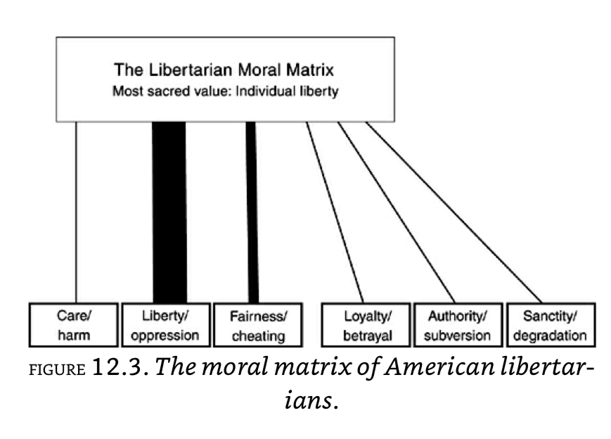 See Jonathan Haidt, The Righteous Mind: Why Good People Are Divided by Politics and Religion (2012). According to this research, we make moral judgments by weighting these values—often in ways that are closely aligned with our identification with a political group. In this country, political liberals are generally moved by values of caring/compassion and fairness/equality, with adherents feeling strong (even visceral) reactions against narratives of harm and inequality. Meanwhile, political conservatives are moved by additional values of sanctity, authority/order, and loyalty, with adherents experiencing strong reactions against narratives involving desecration, disrespect, and disloyalty. And political libertarians are moved primarily by the liberty/freedom value, with strong reactions against government (or other) restrictions on individual freedom and free markets.