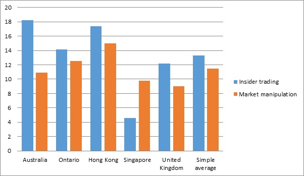 There were also considerable differences in sanction severity between jurisdictions. The differences were more significant for insider trading than for market manipulation. The countries with the most severe sanctions for market manipulation were Hong Kong (15.00) and Ontario (12.50), while the most severe sanctions for insider trading were imposed in Australia (18.2) and Hong Kong (17.35). The least severe sanctions for market manipulation were imposed in the UK (9.02), while in Singapore insider trading sanctions were even less severe (4.6).
