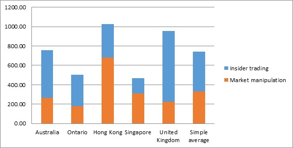 We used our model to compare the severity of sanctions imposed for market manipulation and insider trading in each jurisdiction. As shown below, sanctions imposed for insider trading were more severe than those imposed for market manipulation in each of the jurisdictions apart from Singapore.