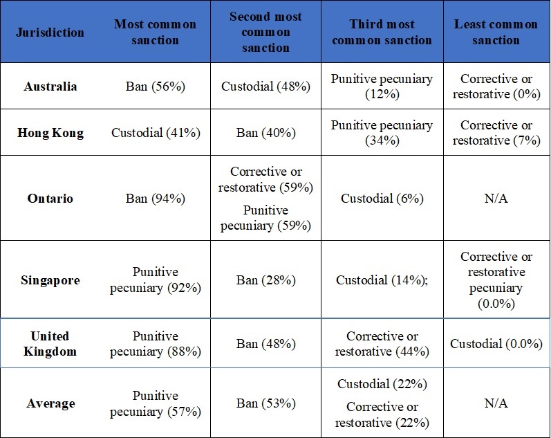 In Hong Kong, around 41 percent of offenders received a custodial sentence, and a slightly smaller proportion of offenders (40 percent) received a ban. Around a third of offenders also received a punitive pecuniary penalty. However, nearly two thirds of the custodial sentences were fully suspended, and the other sentences tended to be substantially shorter than in Australia. A typical offender in Hong Kong received a ban, a short custodial sentence, or a small pecuniary penalty.