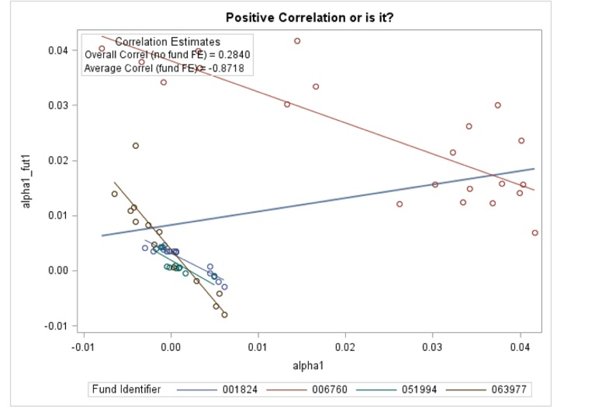 However, the second effect is that for an average individual fund, alphas are negatively autocorrelated. That is, if the fund realized a particularly high alpha last year, it will tend to realize a lower alpha next year, and vice versa. Investing in an individual fund after a period with a particularly high realized alpha is not a good thing (what we call “poor alpha timing”). The accompanying figure, which shows data on past and future alpha for four individual mutual funds, fits a regression line for each fund, as well as for the overall data. The pooled regression line has a positive slope, indicating a positive correlation between past and future alphas; each individual fund has a strongly negative slope, which captures the negative correlation.