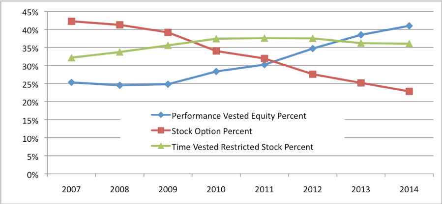 There is reason to believe that investor concerns about pay and related matters extend beyond pay levels and pay increases to issues including the sensitivity of pay to performance and other forms of compensation such as golden parachutes. These conjectures are supported by surveys of institutional investors that confirm that pay for performance sensitivity and the specific metrics used to determine compensation are important to investors(See here, for example). Additionally, ISS and other proxy advisers that make recommendations for say-on-pay votes publish guidelines on their process for developing recommendations that include extensive evaluation of the proportion of compensation that is sensitive to performance and how increases in compensation relate to firm performance. Aggregate trends also provide some support for the possibility that say-on-pay voting influences compensation structure. For example, there is an upward trend in the use of performance-vested equity that coincides with the start of say-on-pay voting (See figure 2).