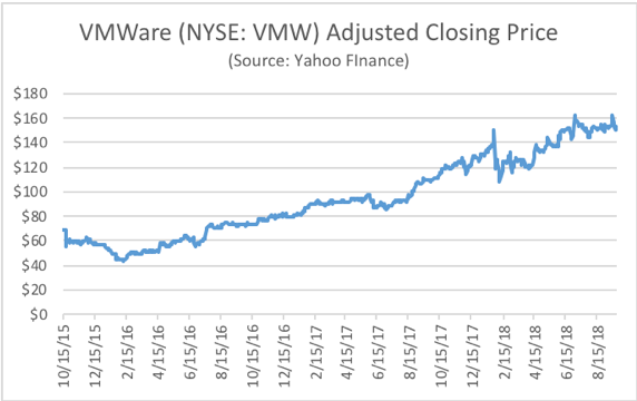 These are all good questions, so let’s take them one at a time. First, contrary to popular belief, today’s Dell is a publicly traded company. Or at least a chunk of it is, as a result of its 2016 blockbuster acquisition of EMC Corporation (the former majority shareholder of the high-growth software company VMWare; NYSE: VMW). Pursuant to the terms of that deal, Dell inherited EMC’s public shareholders, converting them into owners of non-voting Dell Class V tracking stock, pegged against the trading value of VMWare (now a majority-owned subsidiary of Dell). Although the DVMT stockholders have no pass-through rights to dividends (which are rarely paid by tech firms anyway), they capture other economic benefits (including capital gains) associated with Dell’s 82 percent ownership of VMWare.