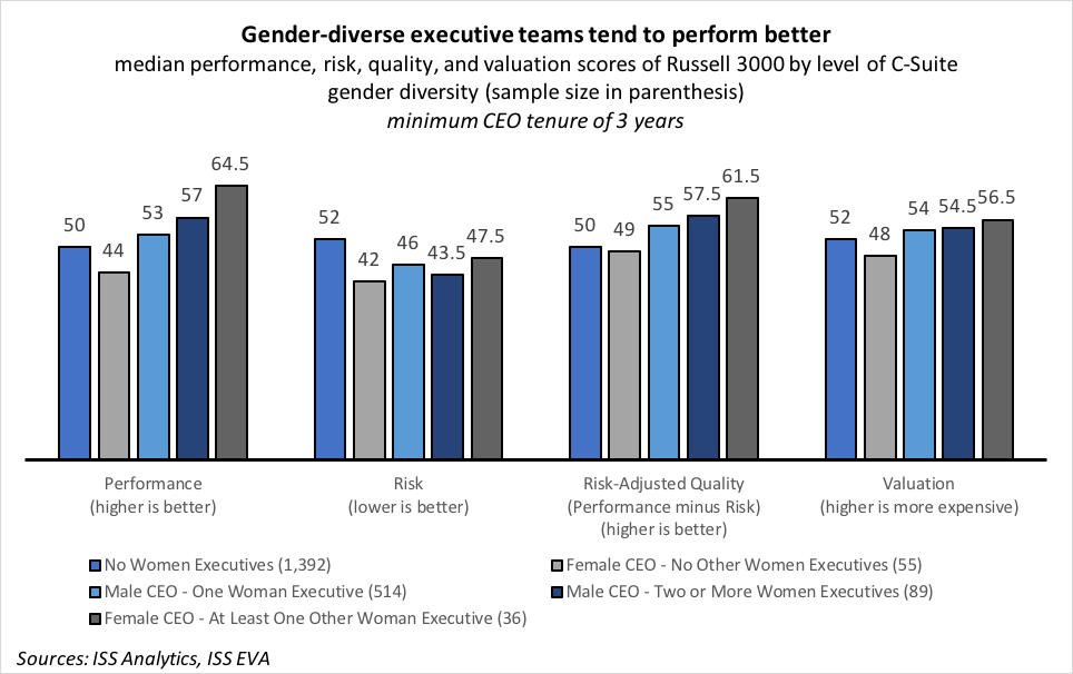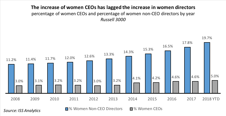 This post comes to us from Institutional Shareholder Services. It is based on the firm’s recent publication, “Female CEOs on a Glass Cliff? A Look at Gender Diversity and Company Performance,” dated October 26, 2018, and available here.