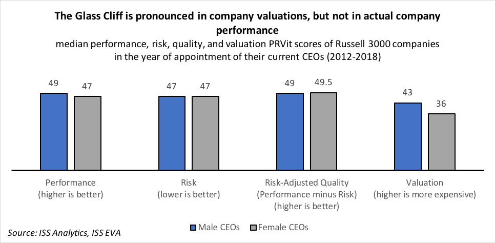 To test for the existence of a glass cliff, we reviewed performance, risk, and valuation scores of Russell 3000 companies during the year of appointment of their current CEOs. Specifically, we reviewed CEO appointments that took place from 2012 to 2018. In our analysis, we do not observe a significant difference in company performance based on the gender of the newly appointed CEO. However, we do note a considerable difference in market expectations in the form of lower valuations for the 84 companies that have women CEOs compared to the 1380 companies that appointed a male CEO. The scores suggest the potential existence of the glass cliff in terms of perceptions about the company as reflected in lower stock prices.
