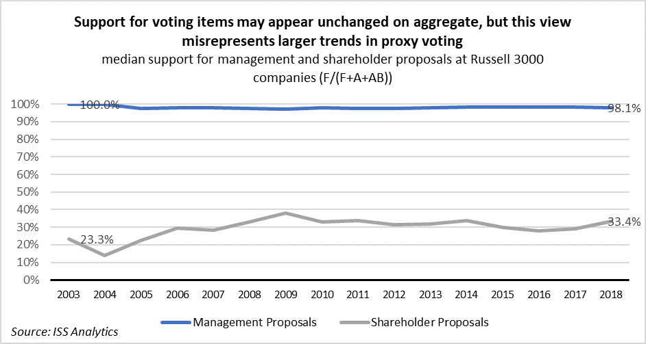 Appearances can be very deceiving. Case in point: The high-level summary numbers of voting results over the last 19 years seem to indicate that little has changed regarding proxy voting behavior among investors owning U.S. companies. A simple analysis of median vote support levels for management and shareholder proposals seems to reveal stasis – support levels remain at approximately the same levels they were back in the early to middle 2000s.