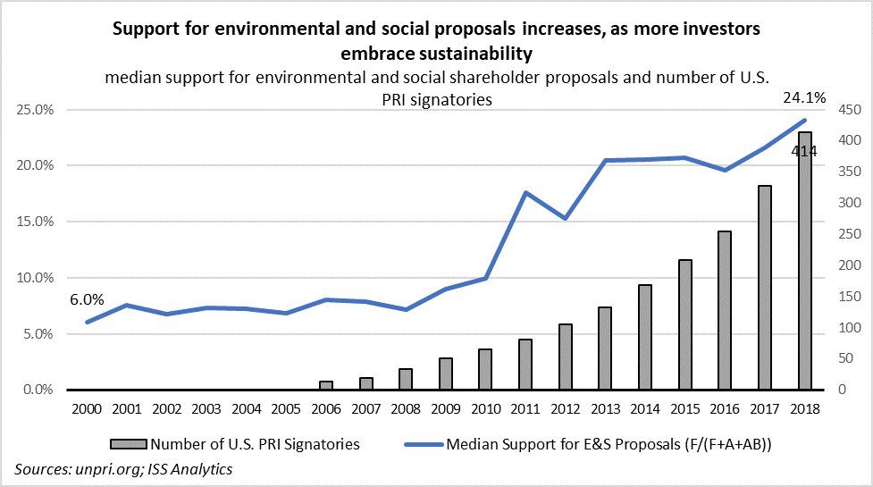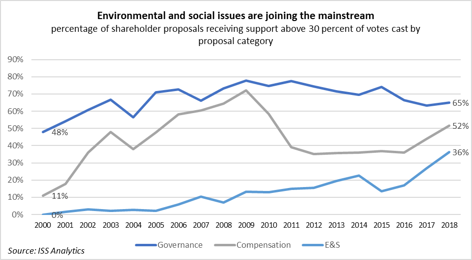 The last decade saw a dramatic change in investors’ attitudes towards environmental and social issues. A confluence of factors has led to the increase in the median level of support for environmental and social shareholder proposals as a percentage of votes cast from the middle single digits from 2000 until 2008 to the 24 percent in 2018, including pressures from the public and regulators in the aftermath of the financial crisis, global policy initiatives, major disaster events, and the evolution of the debate by proponents from a values-based framework to a value-oriented discussion of managing potential business risks. Increasingly, investors embraced sustainability and became more actively engaged on the issues. At the same time, key policy priorities, such as climate change and diversity have given a further boost to shareholder campaigns.