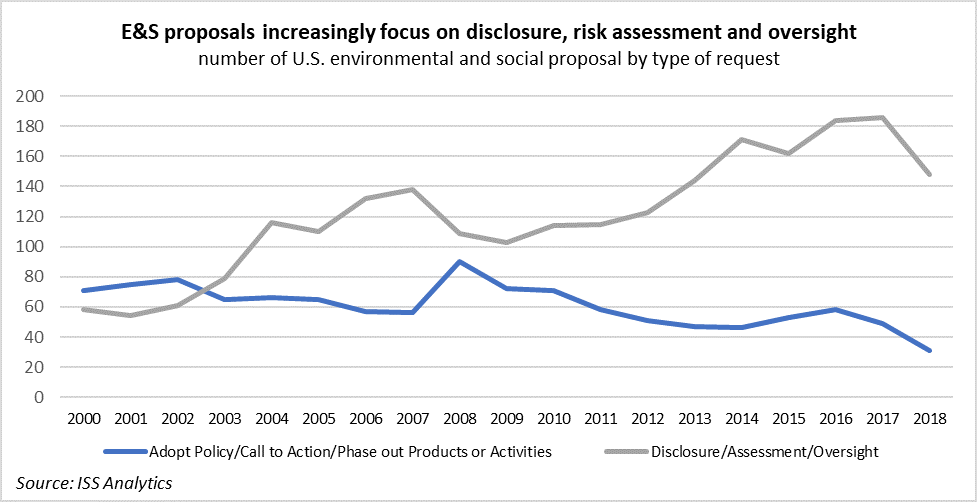 - Shifting environmental and social proposal focus towards disclosure, risk assessment, and oversight, rather than requesting specific actions or policies;
