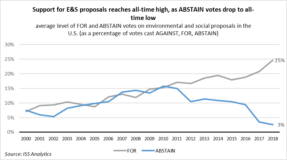 - Fewer investors sitting on the sidelines on environmental & social shareholder proposals, as evidenced by the sharp decrease in recorded “abstain” votes;