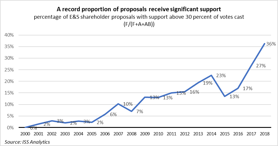 - More shareholders voting in support of environmental & social proposals, witnessed by the rapidly growing proportion of shareholder proposals receiving at least 30-percent support; and