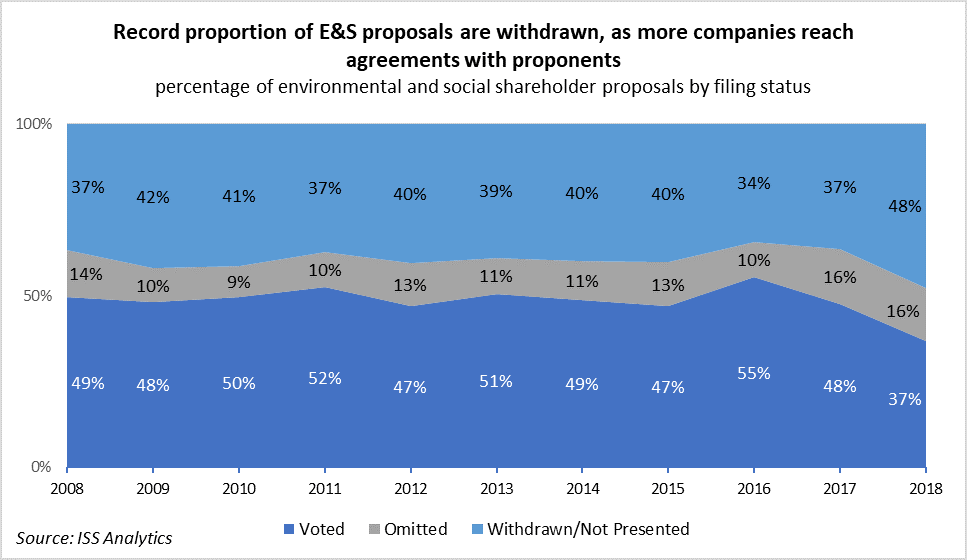 As companies recognize the changing investor attitudes on environmental and social proposals, more of them appear more willing to engage with proponents and reach an agreement about disclosures or policy adoptions, resulting in a high number of proposals withdrawn by proponents. In 2018, 48 percent of filed environmental and social proposals were withdrawn, while only 37 percent of filed proposals went to a vote. These figures were historically reversed, as typically a greater proportion of filed proposal went to a vote compared to those proposals that were withdrawn. The 2018 record number in withdrawal rates along with the record number of support levels for proposals that made it to the ballot indicate an inflection point for environmental and social issues, as these considerations move to the mainstream of investment management.