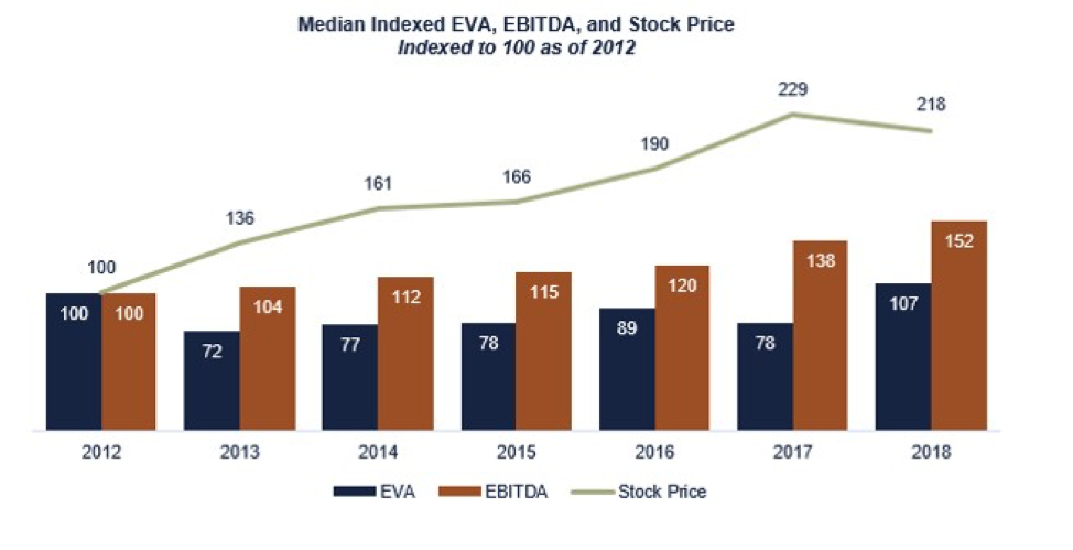 [6] Some observers may notice that if the period were indexed to 2013 instead of 2012, EBITDA and EVA would be close to equivalent in 2018. We note that EVA spikes to this level only in 2018—it catches up to EBITDA at the very end (ending indexed values for EVA, EBITDA, and stock price, respectively: 149, 146, 160). Over the period measured, EBITDA grew steadily along with stock price increases. EVA moves inconsistently with stock price.