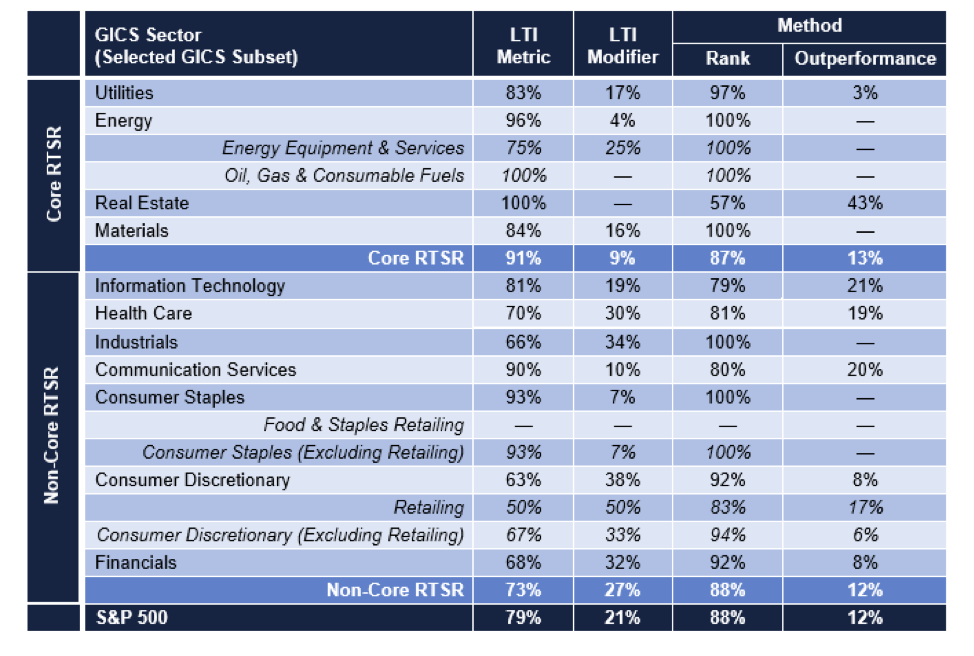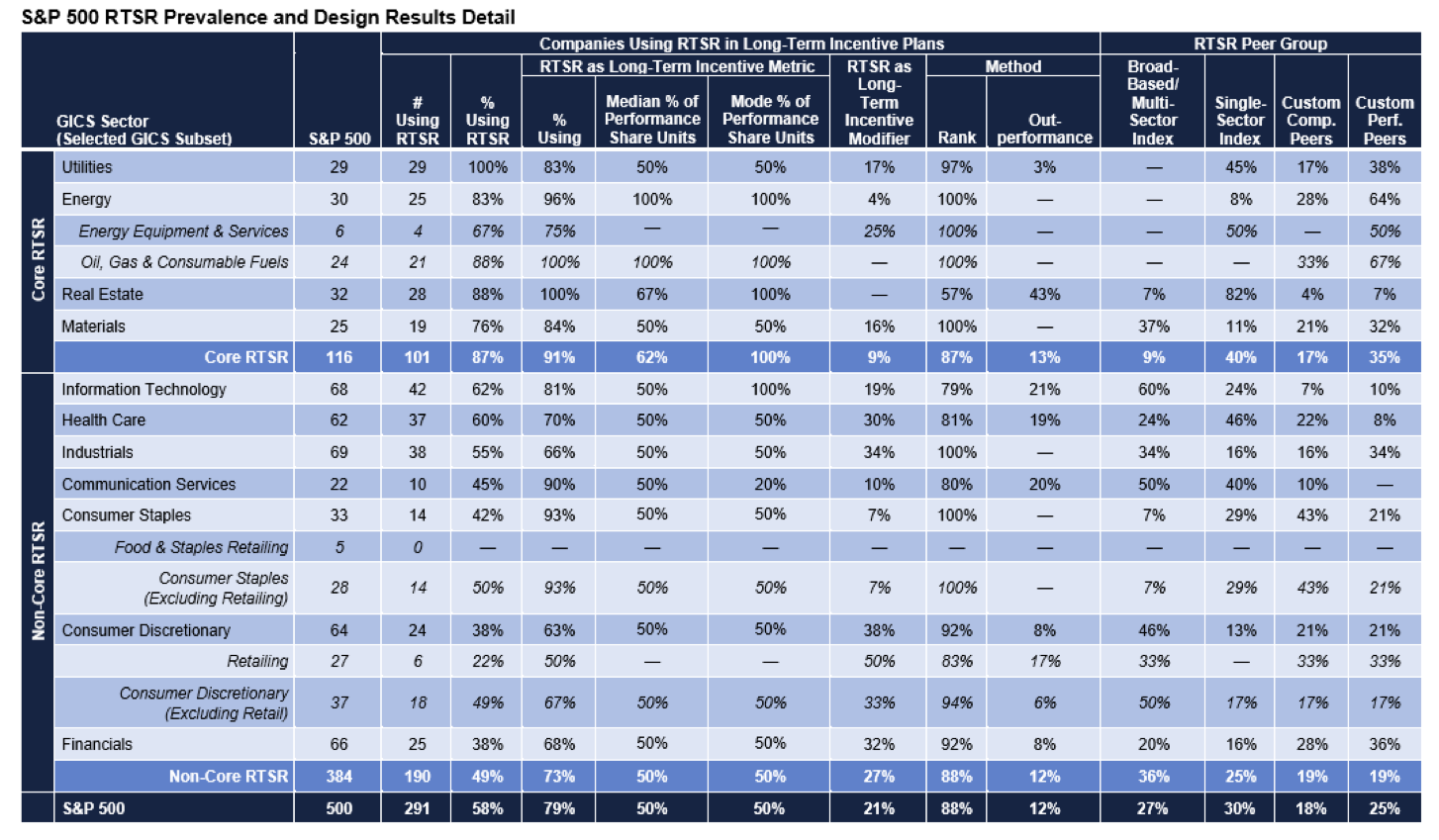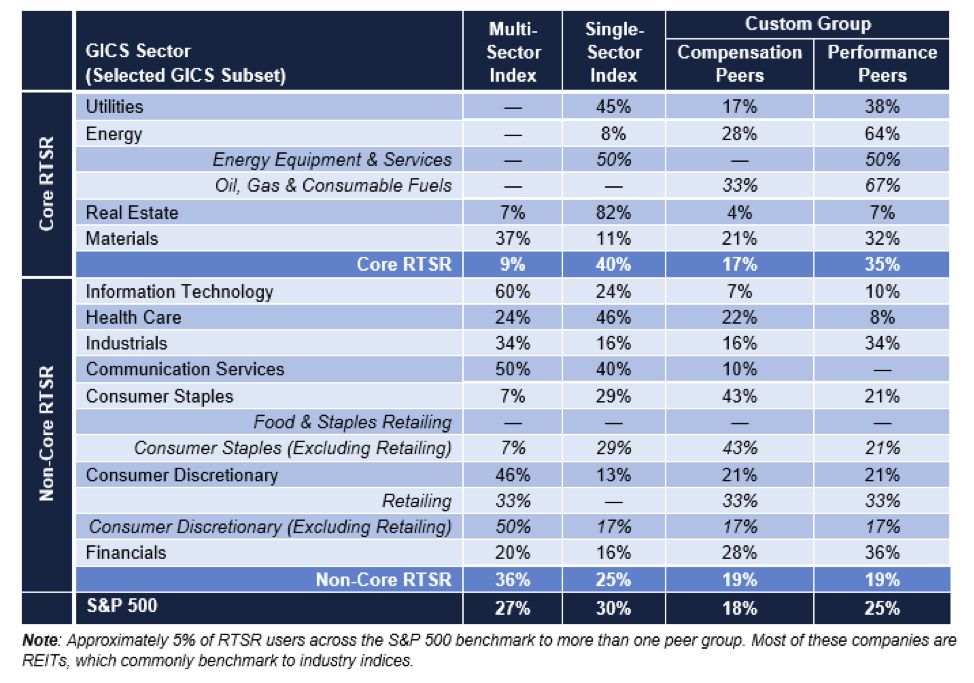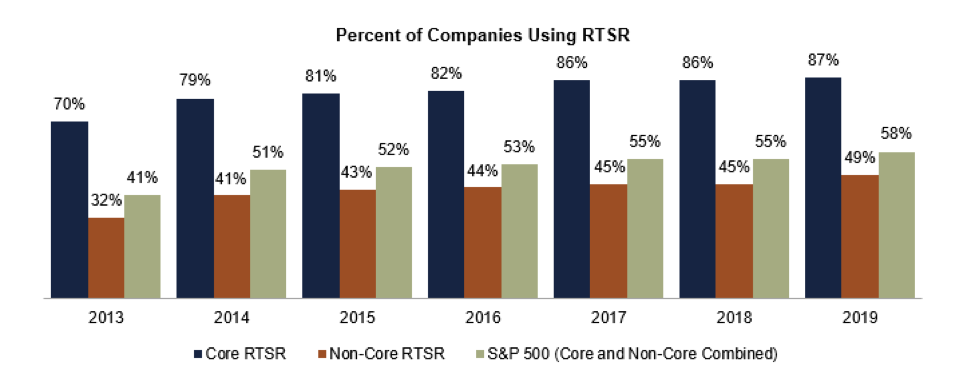 Energy and Utilities companies continue to be the primary users of RTSR across the S&P 500, with 83% of Energy and 100% of Utilities companies using RTSR. Materials and Real Estate companies report high RTSR prevalence as well, 76% and 88%, respectively. Within each of these high-prevalence sectors, companies tend to face similar commodity price pressures or economic similarities, potentially rendering RTSR a more reliable method for identifying financial and operational outperformance via market performance. (We refer to Energy, Materials, Real Estate, and Utilities companies collectively as the Core group of RTSR users, while the remaining companies we refer to as Non-Core.)