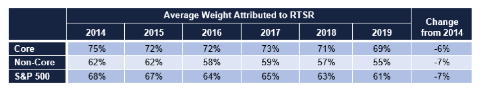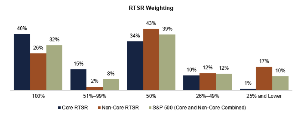 Over the past five years, the average weight given to RTSR as a metric has decreased by 6%. Notably, this trend holds across both Core and Non-Core companies. The table below displays the average weight attributed to RTSR (excluding RTSR modifiers).