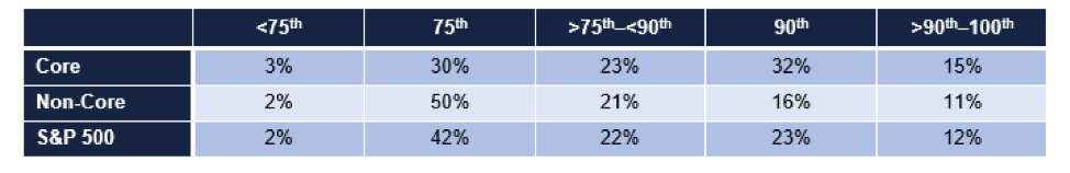Core companies tend to place greater weight on RTSR in performance plans than Non-Core companies. 40% of Core companies use RTSR as the only performance measure in their performance plans versus 26% of Non-Core companies. The graph below presents RTSR weightings as a percentage of total performance shares across Core and Non-Core companies.