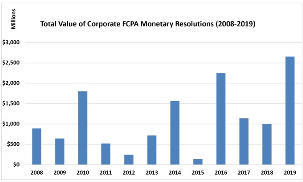 Together with the other enforcement activity from 2019, corporate fines in FCPA cases topped $2.5 billion for the first time in the history of the statute. A chart tracking the total value of corporate FCPA monetary resolutions by year, since the advent of blockbuster fines brought in with the 2008 Siemens resolution, follows: