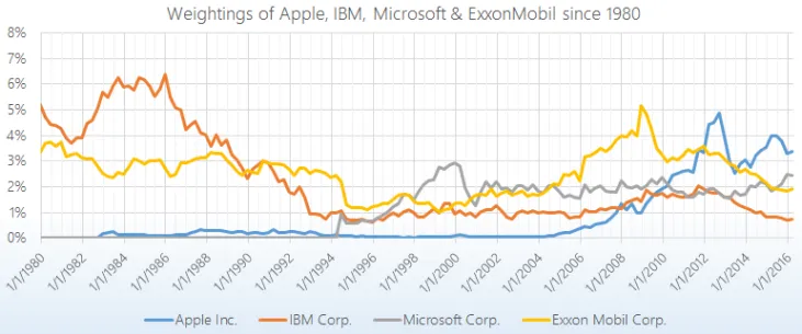 - As of January 2020, Apple, Microsoft, Alphabet, Amazon, and Facebook account for 17.5 percent of the S&P 500, creating risk of overexposure to passive investors. [5]