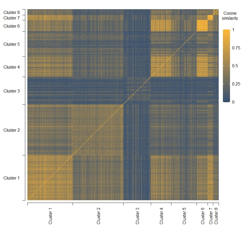 Figure 2 contains a heat map that conveys more details about the similarity of documents in the various clusters. In this graphic, each document is represented by one row and a corresponding column, and the cells in that row have different colors, depending on the similarity between the document and other documents (which are represented as the columns in this graphic): A yellow cell indicates a high degree of similarity, while blue cells indicate substantial differences. This representation roughly confirms the insights obtained from Figure 1: Clusters 2, 3, and 5 are markedly different from the documents in other clusters. Especially in case of clusters 3 and 5, there is also considerable heterogeneity among the documents within the same cluster.