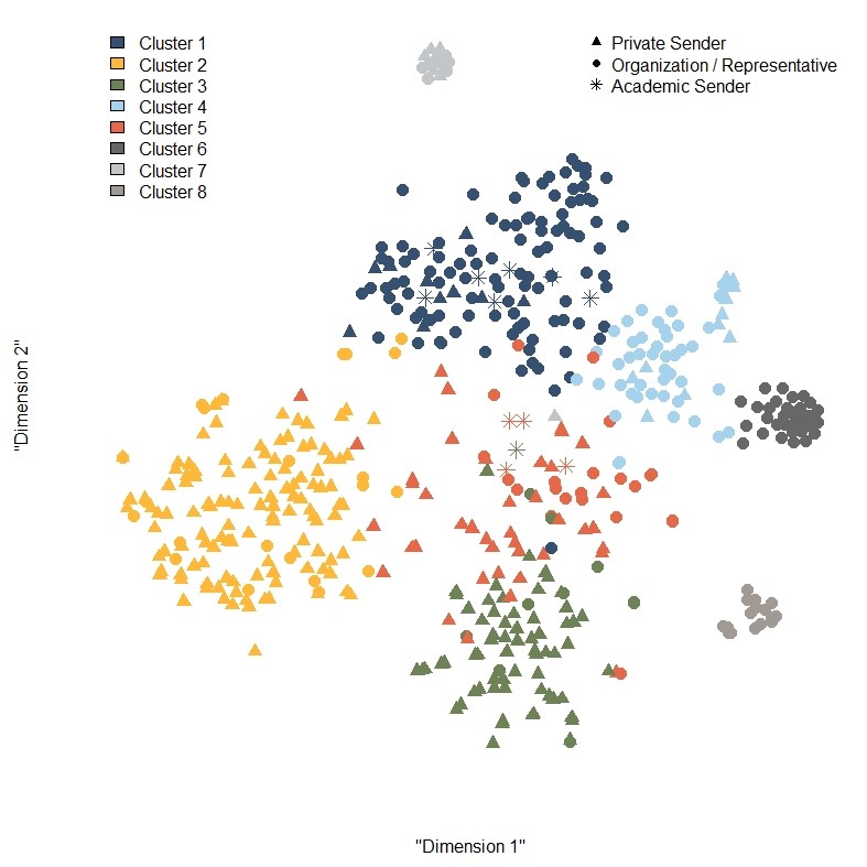 A common trick in computational text analysis is to transform complex documents into a low-dimension numerical score. Figure 1 employs this approach to provide an overview of all comments. Documents that are similar to one another will tend to cluster in tight local neighborhoods, and one can see several such clusters in Figure 1.[5] The graphic also differentiates between different senders, subdividing among three groups: (a) private persons (anyone who did not include an institutional affiliation in their sender information), (b) institutional senders (anyone who wrote in their capacity as a member of an organization), and (c) academics (anyone who included the word “professor” in their identifying salutation).