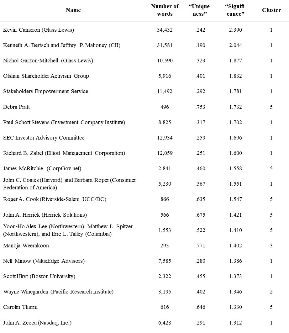 It turns out that there is. One helpful approach for doing so is to use a metric that combines information about the length of a letter with information about the uniqueness of the vocabulary in the letter. More precisely, the measure is based on the logarithmic value of the number of words in a letter as well as 1 minus the average distance (measured as cosine similarity) from the 25 comments that are most similar to a letter. The “significance score” is derived by calculating the sum of the normalized value of both measures. Table 1 reports the leading 20 comment letters in this category.[8]
