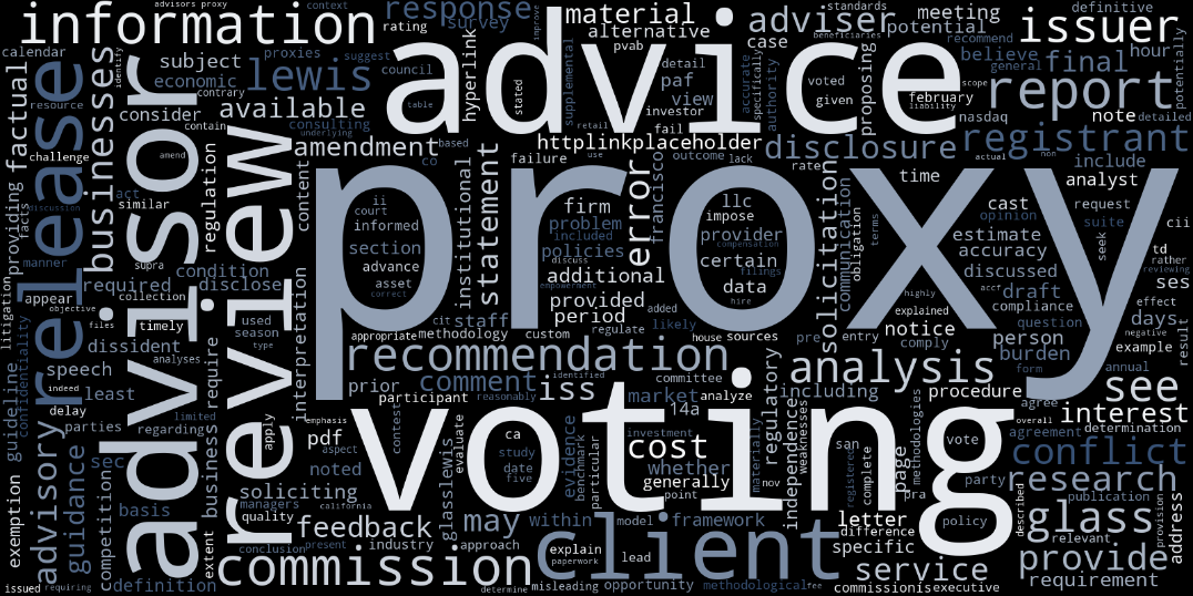The first cluster, depicted in dark blue in Figure 1, contains comments that one might consider typical of sophisticated organizations and individuals whose professional interests are affected by the rules proposed by the SEC. Most comments in this cluster were written by institutional senders, and the cluster also contains a relatively large share of comments written by academics as well. Comments in this cluster are on average almost 200 percent longer than the average comment in the other clusters, and readability scores indicate that the language of these documents is also fairly complex. The rather technical nature of these comments is also reflected in the characteristic vocabulary of letters in this cluster, which is captured in the word cloud below.[6] By contrast, this vocabulary does not seem to allow for easy inferences about the main thrust of these comments, a finding that is also confirmed by a manual review of a random selection of comments in this group. Of 20 randomly selected documents in this cluster, nine opposed the proposed changes, eight expressed support (although four suggested some modifications), and three expressed neither support nor opposition.