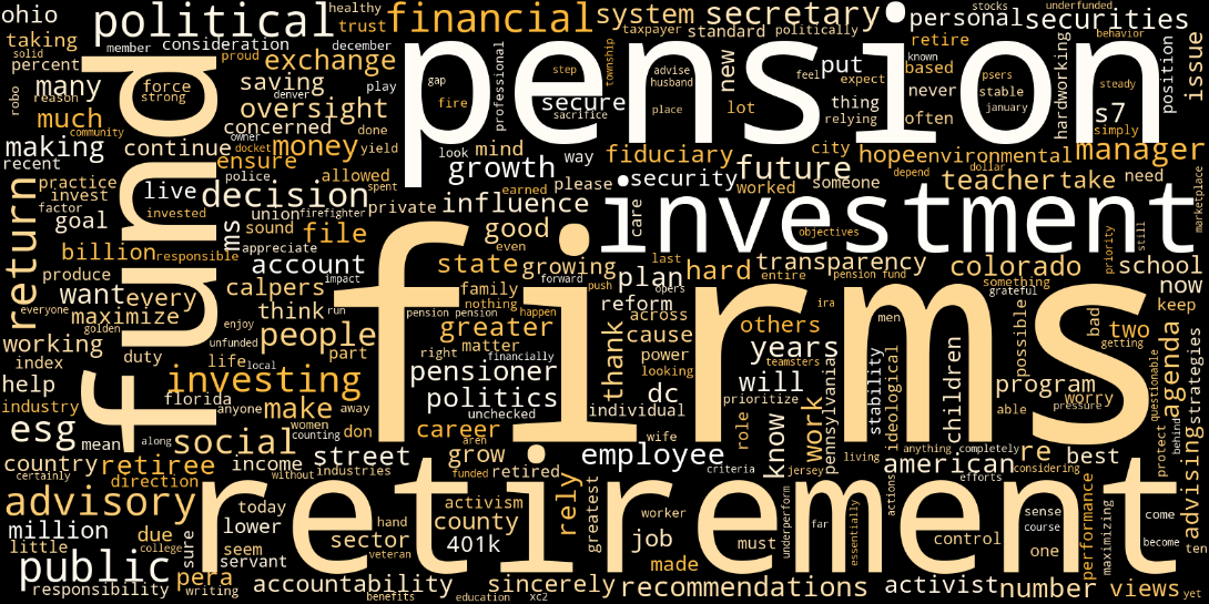 The second cluster, depicted in yellow in Figure 2, seems to consist largely of documents that are markedly different from most other comments. In fact, many comments in this cluster are written by private persons, and many of these comments address concerns about the impact of the role of proxy advisers on retirement savings, a topic that is also reflected by the typical vocabulary displayed in the word cloud for this cluster. More precisely, many senders describe a politically motivated agenda of proxy advisers, which they perceive as a threat to the financial performance of pension funds. These are the reasons why many letters in this cluster come out in support of the rules proposed by the SEC. This tendency is also reflected by the fact that the language of letters in this clusters is on average more positive than the language in most other clusters.