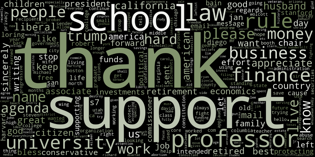 Like the second cluster, the third cluster also occupies a position further away from other clusters, although the overlap with other clusters is slightly more pronounced than in the case of Cluster 2. Also similar to the second cluster, the third cluster consists mostly of letters written by private persons. These documents are on average shorter than the documents in any other cluster, with most documents not longer than a paragraph. As can be seen from the word cloud, the typical language in this cluster is rather nontechnical, with many senders basing their support of the proposal on general views about the world, be they political or otherwise. God is mentioned more often than in other comments, and so is President Trump.