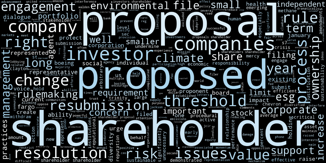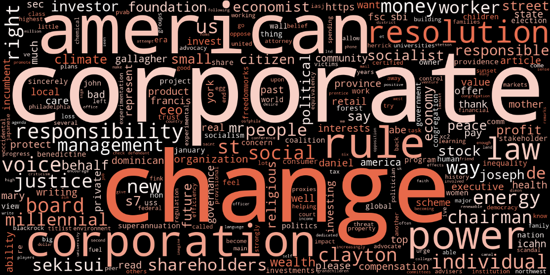The fourth cluster consists mostly of letters written by investors and investment managers. Letters in this group mostly oppose the proposed rules as limiting the possibilities of shareholders to influence the decisions of corporations. This is reflected in the vocabulary typical of letters in this cluster, which contains a number of words related to shareholder engagement.