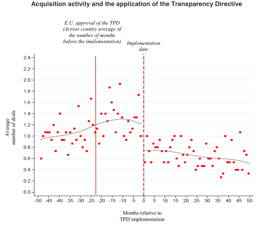 In sum, takeover activity decreased under this disclosure regulation, especially in more dynamic M&A markets, but we can’t categorically conclude that it has had a negative effect overall. It could be that the Transparency Directive stopped the stealth takeovers that were socially suboptimal, perhaps because they were driven by interests other than economic efficiency or boosting productivity. In any case, an active M&A market tends to be beneficial from an economic and productivity point of view, so it’s worth watching closely if regulations slow it down.