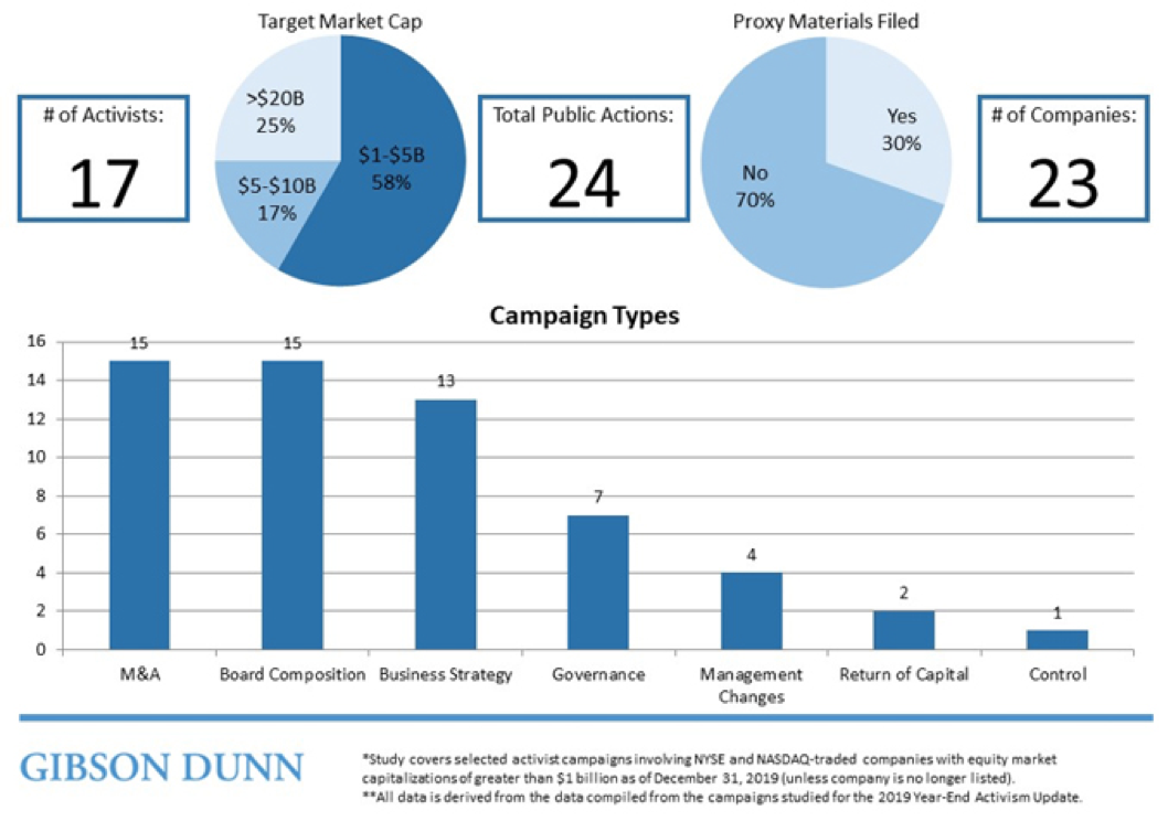 This post comes to us from Gibson, Dunn & Crutcher LLP. It is based on the firm’s memorandum, “M&A Report – 2019 Year-End Activism Update,” dated May 11. 2020, and available here.