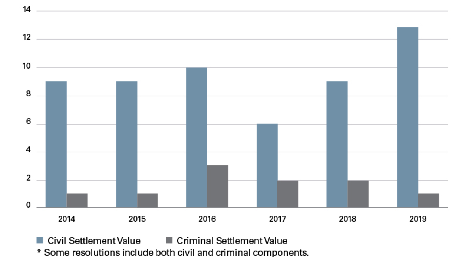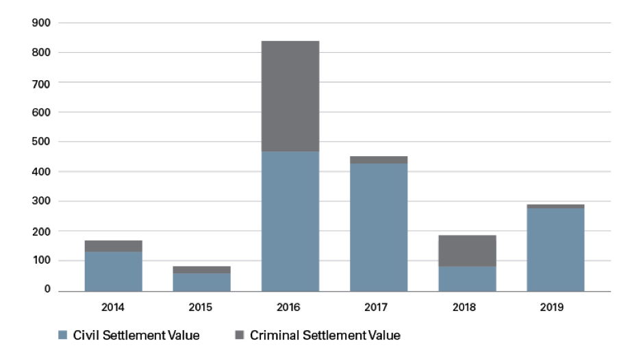 Medtech enforcement activity remained steady throughout the past six years, with a high of 14 settlements in both 2016 and 2019 and a low of eight settlements in 2017. Collectively, the 67 settlements between 2014 and 2019 resulted in more than $1.9 billion in fines, penalties and forfeiture, with $1,425,000,000 in civil damages and penalties and the remaining $525,000,000 in criminal fines and forfeiture.
