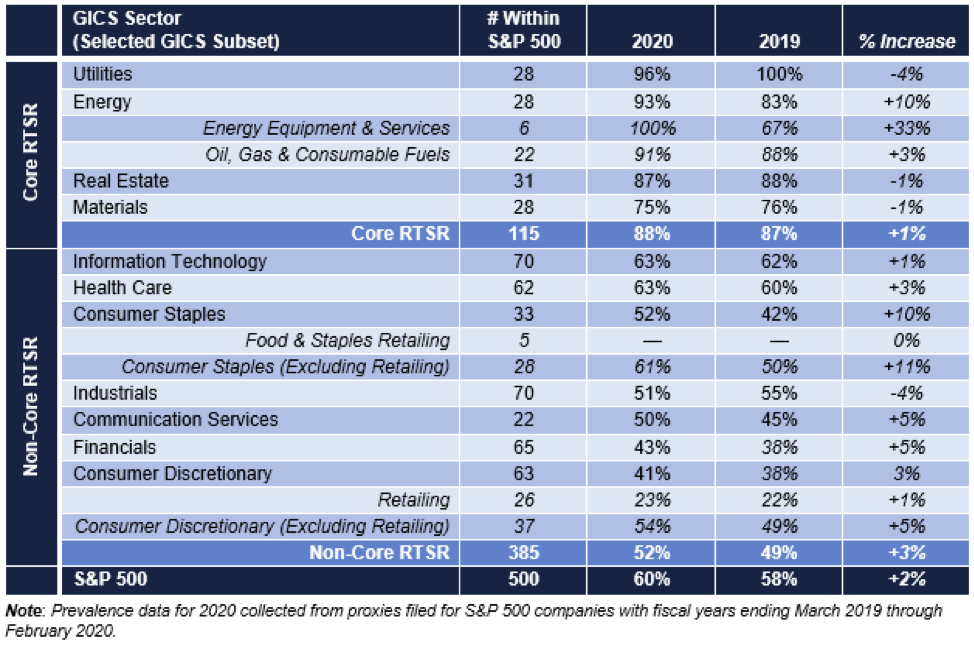 Note: Prevalence data for 2020 collected from proxies filed for S&P 500 companies with fiscal years ending March 2019 through February 2020.