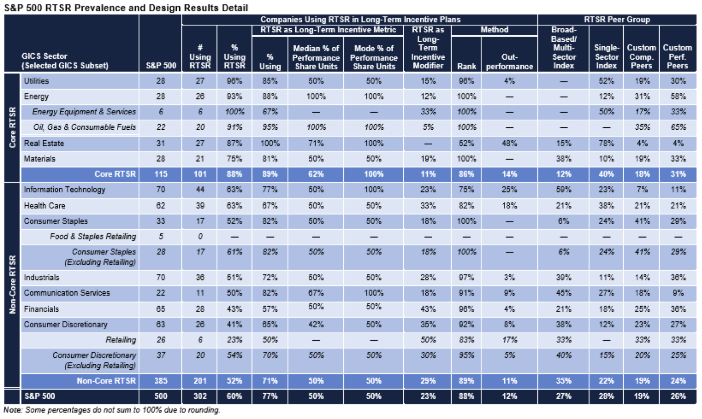 Energy and Utilities companies continue to be the primary users of RTSR across the S&P 500, with 93% of Energy and 96% of Utilities companies using RTSR. Real Estate and Materials companies report high RTSR prevalence as well, 87% and 75%, respectively. Within each of these high-prevalence sectors, companies tend to face similar commodity price pressures or economic similarities, potentially rendering RTSR a more reliable method for identifying financial and operational outperformance via market performance. (We refer to Energy, Materials, Real Estate, and Utilities companies collectively as the “Core” group of RTSR users, and the remaining companies as “Non-Core.”)