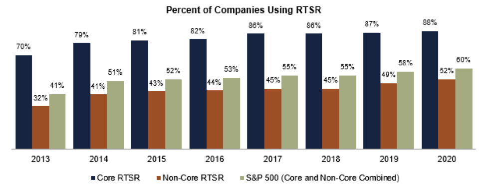 We note that Non-Core RTSR companies use RTSR with less frequency than Core companies. Prevalence among other Non-Core companies is generally within the 40%–60% range.[3] We would posit that Non-Core companies experience a more diverse array of stock price pressures than do Core companies.