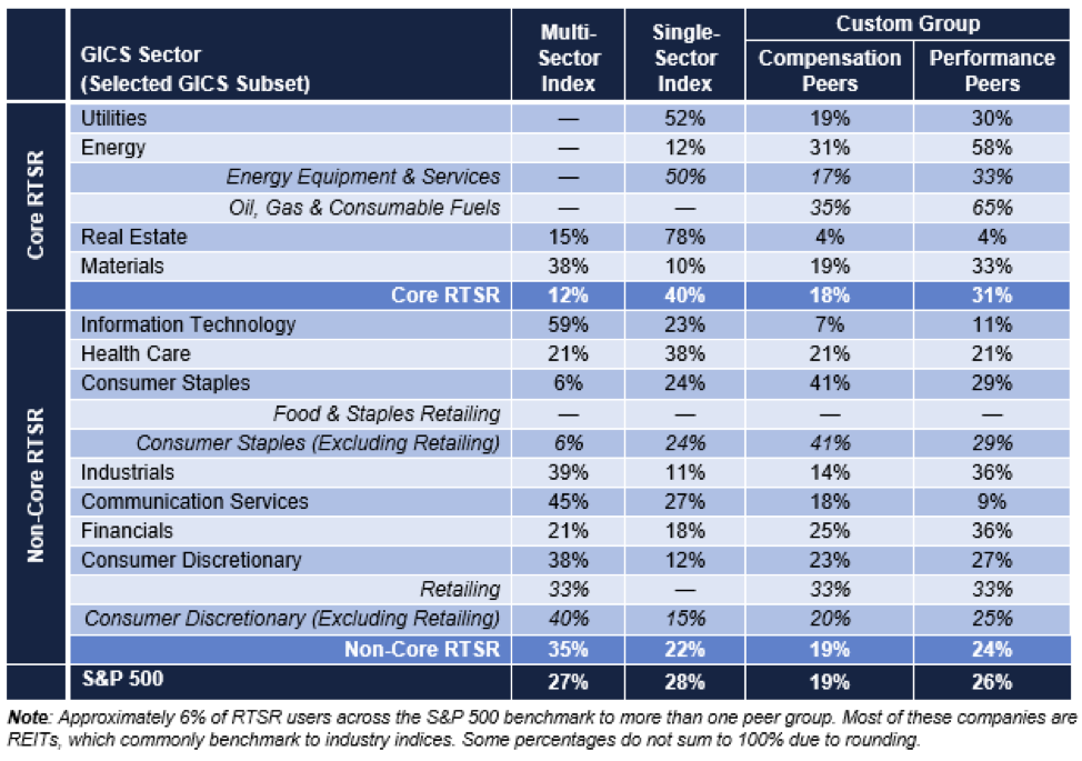 Note: Approximately 6% of RTSR users across the S&P 500 benchmark to more than one peer group. Most of these companies are REITs, which commonly benchmark to industry indices. Some percentages do not sum to 100% due to rounding.