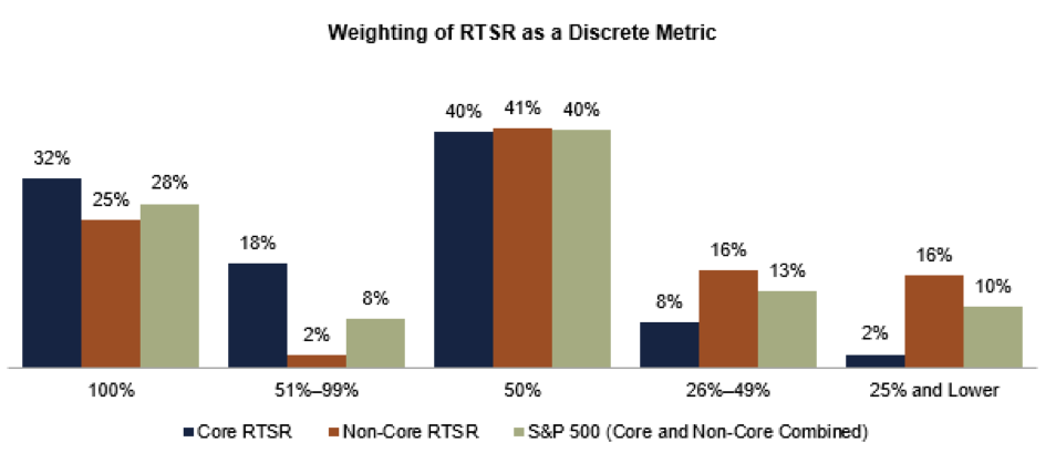 Used as a discrete metric, RTSR is assigned a weighting within the performance share plan (e.g., 50% RTSR and 50% return on capital). The most common RTSR weight for a discrete metric is 50% for both Core and Non-Core companies. This is a notable change from 2019, when the most common RTSR weight among Core companies was 100%. Nonetheless, Core companies continue to place slightly greater weight on RTSR in performance plans than Non-Core companies, with 32% of Core companies using RTSR as the only performance measure versus 25% of Non-Core companies. In 2019, 40% of Core companies used RTSR as the sole performance metric and 34% weighted it 50%. The graph below presents RTSR weightings as a percentage of total performance shares across Core and Non-Core companies.
