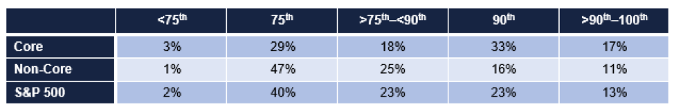 While the single most common maximum performance percentile remains at the 75th, it is a majority practice for companies to require performance to exceed this level. Nearly 60% of all S&P 500 companies require performance above the 75th percentile for RTSR plans to pay at maximum. Core companies tend to require higher performance levels for a maximum payout than Non-Core companies, with 68% of Core companies requiring performance exceeding the 75th percentile, versus 52% for Non-Core companies. The general trend is towards increased performance requirements, with companies requiring higher performance levels to achieve a maximum payout. The table on the next page displays maximum performance percentiles required to achieve maximum payouts.