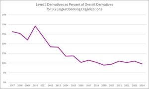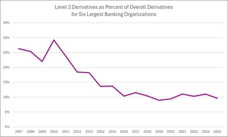 Figure 1 shows the substantial decline of Level 3 assets among assets subject to recurring fair valuation over the time period in question. As reflected in Figure 2, a similar pattern of decline in complexity is observed if focusing exclusively on derivatives. Although figures 1 and 2 aggregate data across the six institutions, individual institutions exhibit consistent trends. As explored in the underlying paper, financial instruments subject to recurring fair valuation (i.e., the denominator) have increased in this period, while Level 3 instruments (i.e., the numerator) have declined.