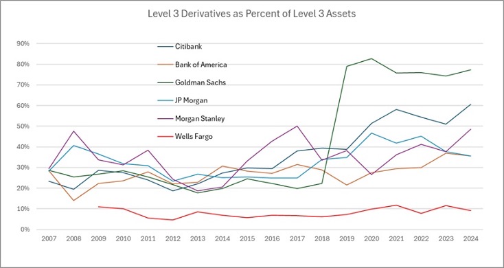 The remainder of this post presents and discusses the importance of Level 3 instruments between 2007 and 2024 to the balance sheets of the six largest U.S. banking organizations: Bank of America, Citibank, Goldman Sachs, JP Morgan, Morgan Stanley, and Wells Fargo. These institutions are of central importance to discussions of systemic risk as they represent firms (a) that are too big to fail, and (b) with the greatest sophistication and hence expected involvement with complex instruments.