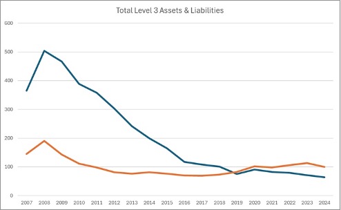 If focusing on just Level 3 derivatives, the trends are similar, albeit liabilities come to exceed assets earlier, around 2013.[2]