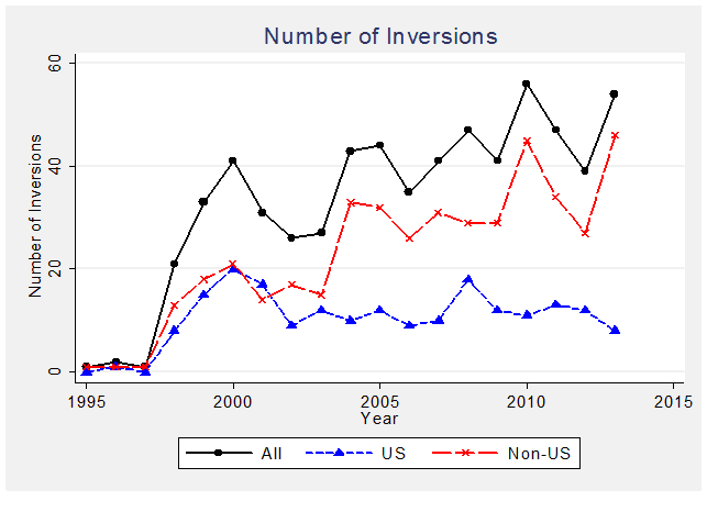 Despite the attention given to corporate inversions in the US, our data shows that corporate inversions are not a US phenomenon. Less than one third of inversions involved US firms. Moreover while inversions have become increasingly popular around the world, the annual number of inversions out of the US has remained constant over the last 15 years (Figure 1).