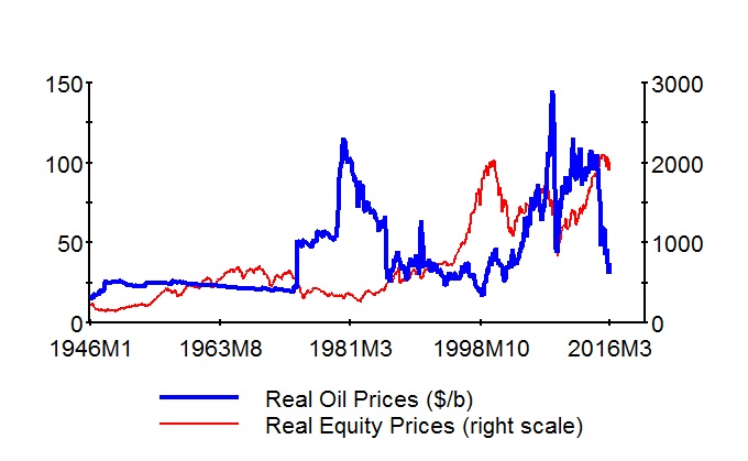 Taking a relatively long historical perspective (1946-2016), we show the monthly evolution of real oil prices, in 2015 U.S. dollars per barrel, and U.S. real equity prices, as measured by the S&P 500 index. Figure 1 makes clear that there is little evidence of a stable relationship between oil prices and real equity prices. In particular, there are sub-periods where changes in real oil prices and real equity prices are unrelated, as well as sub-periods over which they are negatively and positively correlated.