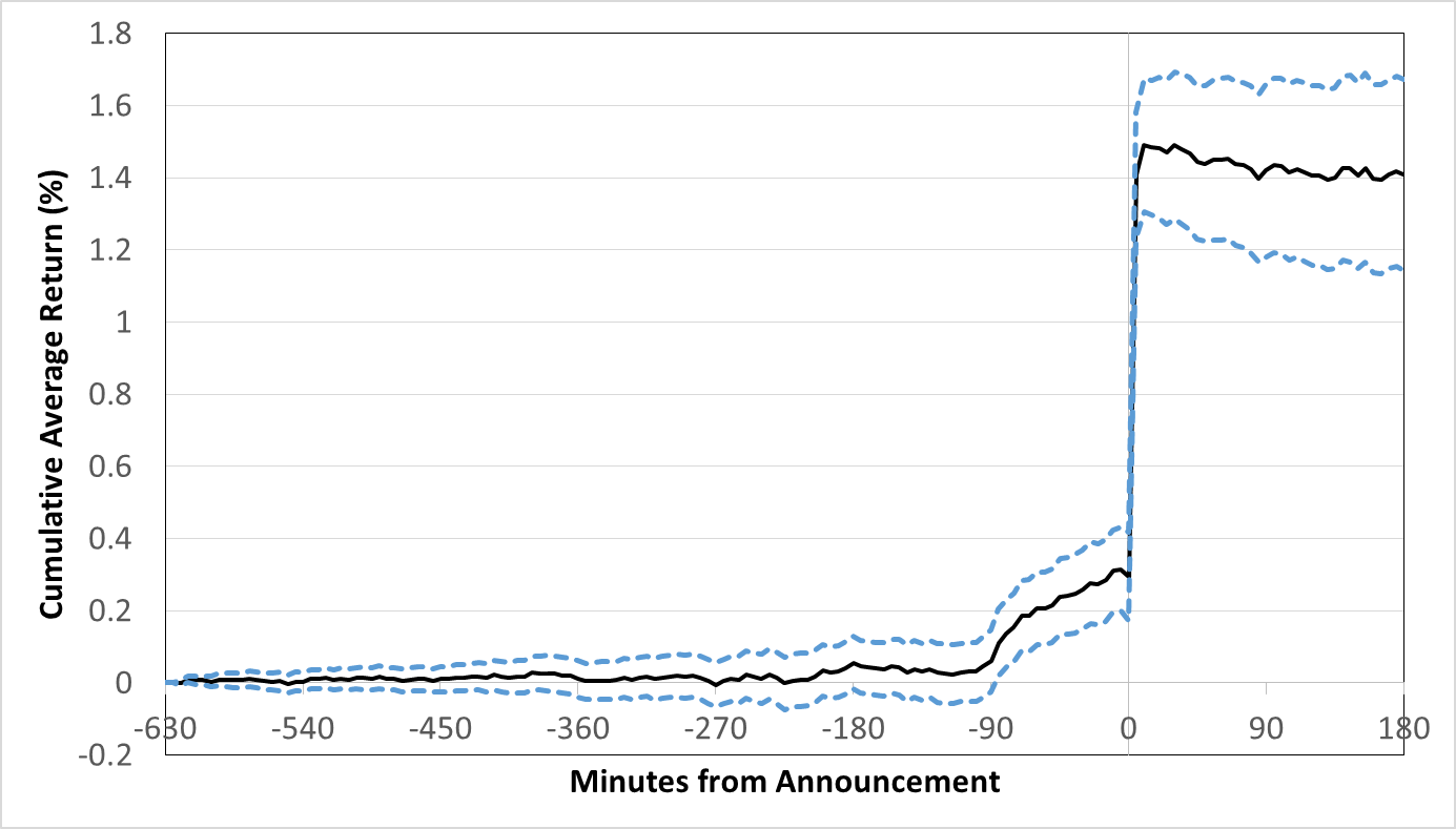 Security prices contain information. Private information is reflected in prices through trading. Public information is generally believed to be incorporated in prices before anyone can trade on it. In a recent study, we examine whether some traders are able to make profitable trades by using public information. Specifically, we analyze futures returns and trading activity around releases of the Weekly Natural Gas Storage Report. This report is issued by the U.S Energy Information Administration (EIA) and contains information about U.S. inventory of natural gas. It is widely followed by traders because its release often triggers large price moves. The report is posted on the EIA website every Thursday at 10:30 a.m. ET. Therefore, it is public information. However, we find evidence of informed trading before the release of the report. The figure below shows that natural gas futures prices begin to drift in the “correct” direction about 90 minutes prior to the announcement. The pre-announcement returns and order flow in natural gas futures are significantly correlated with inventory surprises based on the consensus analyst forecast, suggesting that informed traders correctly anticipate inventory news.