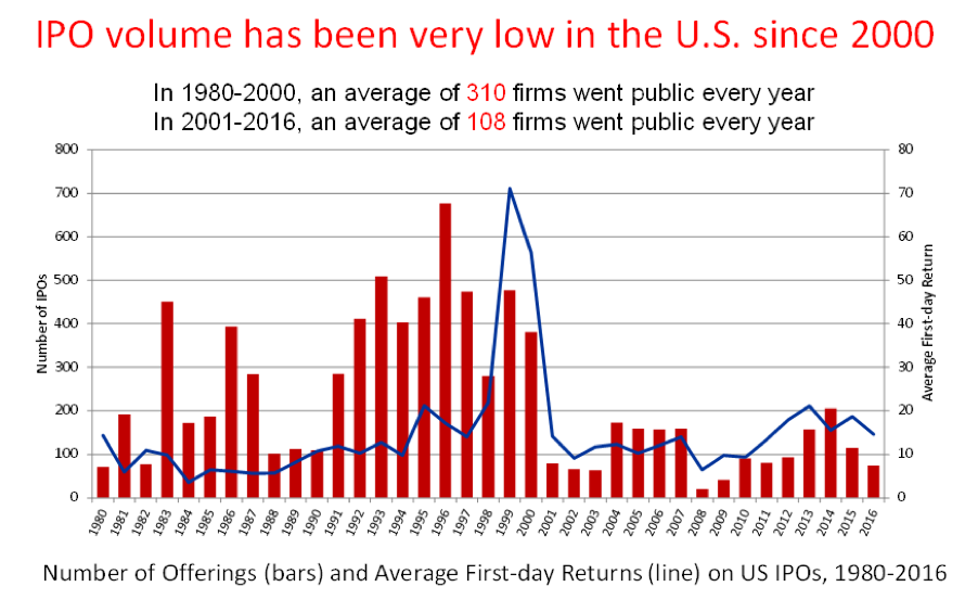 The basic pattern is shown by Exhibit One, which shows that not only have the average number of IPOs declined (from 310 a year in 1980-2000 to 108 from 2001-2016), but the first day returns (and thus the returns that attract investors and underwriters) have declined dramatically: