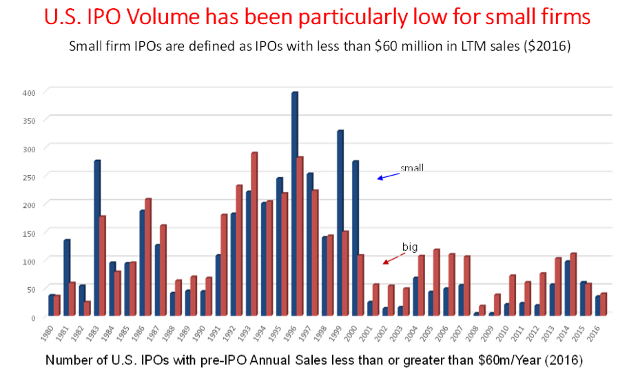 2. The JOBS Act did nothing to turn this problem around, and indeed IPO volume in 2015 and 2016 was lower than in many years before the JOBS Act. Although there has been an uptick this year in the case of high-tech offerings, other offerings (and particularly smaller ones) remain in a deep freeze.