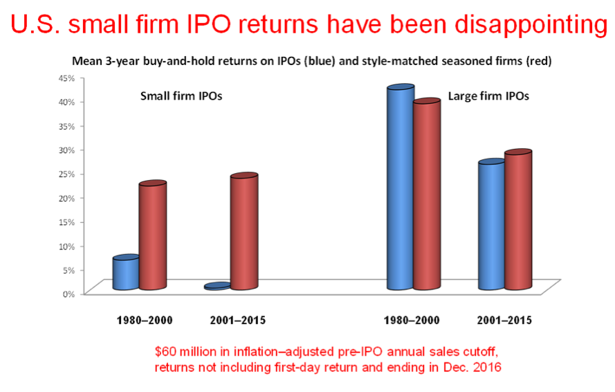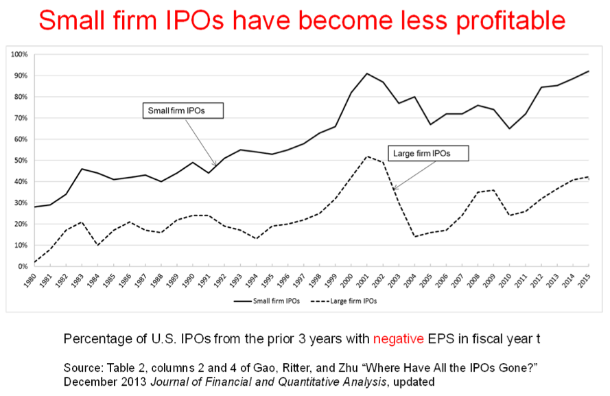 B. IPOs for smaller firms have been consistently unsuccessful for a sustained period, losing money for all concerned (both investors and underwriters). Finance professor Jay Ritter, the leading scholar on IPOs, has recently released data showing that a high majority of small offerings have had negative earnings per share for years after the offering and poor first day returns. Thus, analysts and underwriters tend to shun such offerings. Academic research suggests that the relative disappearance and unprofitability of smaller firm IPOs is because such firms cannot gain the economies of scale and scope that are increasingly necessary to compete in a globalizing marketplace.[2].