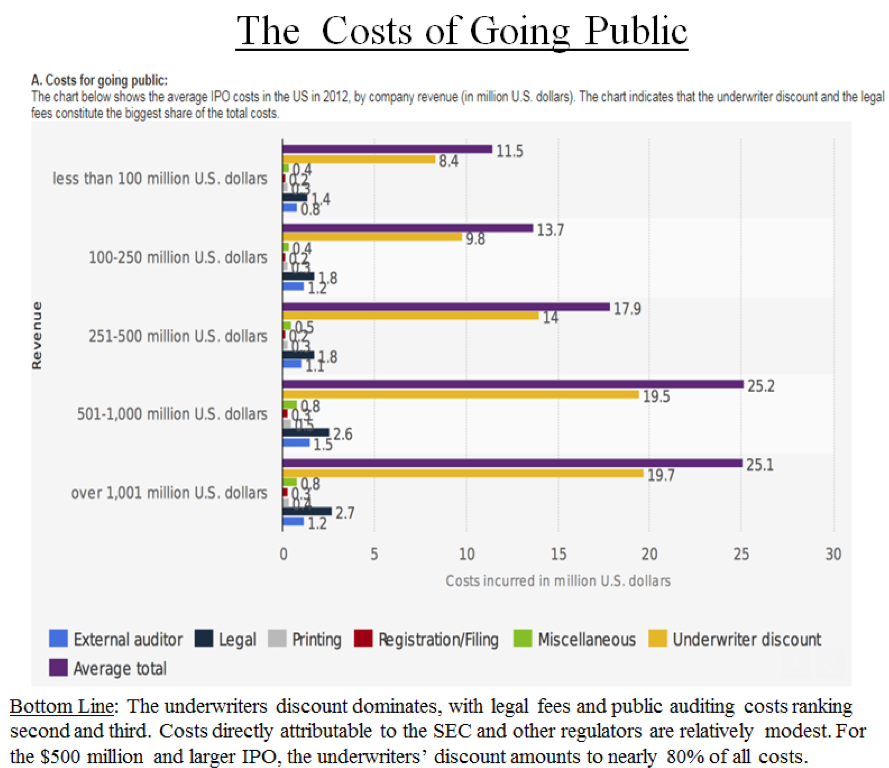 Nothing else comes close to the underwriter’s discount, with legal and audit costs coming second and third. Legal fees range between 10 percent to 13 percent of the total costs. The actual SEC registration and filing costs are trivial and in the 1 to 2 percent range). Although these proposals might reduce legal and auditing costs somewhat, the reduction would be modest to an already minor cost.