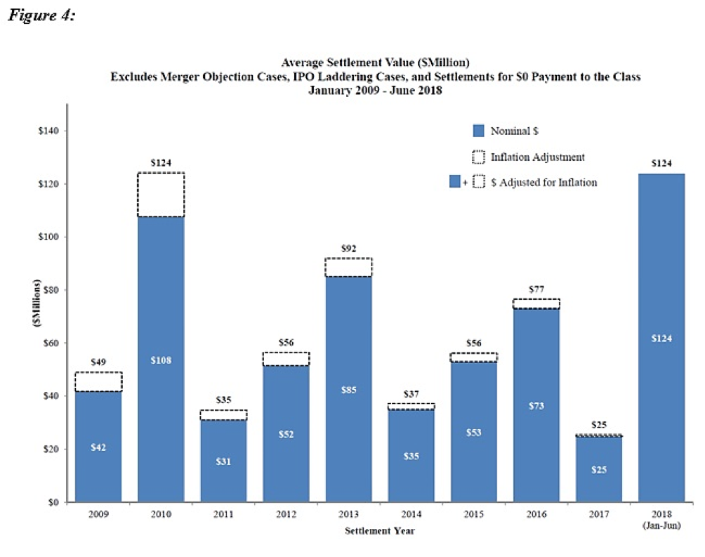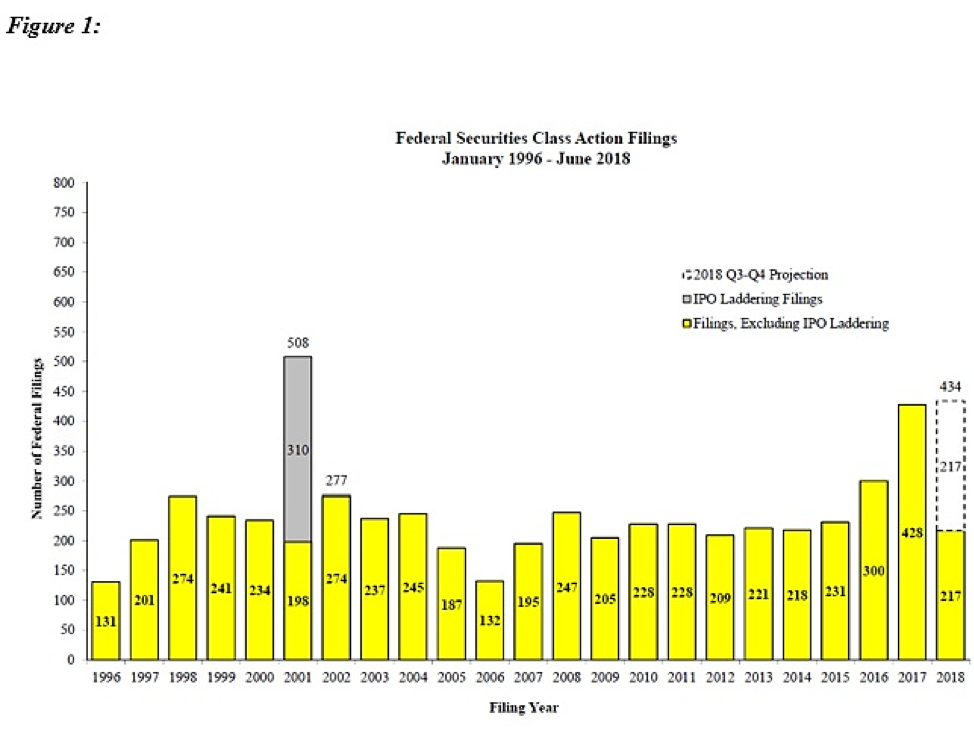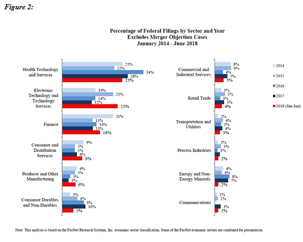 Figure 1 below reflects filing rates for the first half of 2018 (all charts courtesy of NERA). Two hundred and seventeen cases have been filed so far this year, annualizing to 434 cases. This figure does not include the many class suits filed in state courts or the rising number of state court derivative suits, including many such suits filed in the Delaware Court of Chancery.