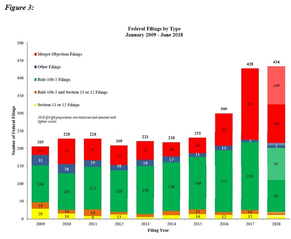 As shown in Figure 3, 109 “merger objection” cases have been filed in federal court in the first half of 2018 alone—continuing a high rate of such filings from 2017, which saw a drastic increase in the number of such cases over previous years. If the 2018 pace continues, this year will see an increase both in the total number of these cases filed in federal court and in the percentage of federal filings that are merger objection filings.